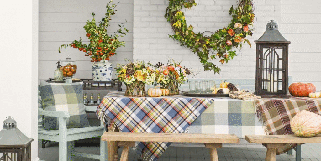 Use pumpkins, layered planters, and a rustic welcome mat to set the tone. Add wreaths made from dried leaves or wheat. Lanterns and candles provide light for longer evenings. Layer blankets on benches and plaid pillows on chairs for cozy comfort. Mixing natural and decorative elements creates a festive, balanced look. Your porch can become an inviting autumn haven for guests.